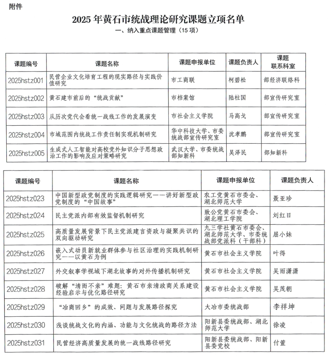 近日,黄石市委统战部发布了《关于公布2025年度黄石市统战理论研究课题立项结果的通知》。其中,我院马高戈、吴茂朝、吴雨潇潇、叶得等四位老师申报的课题成功获批立项。