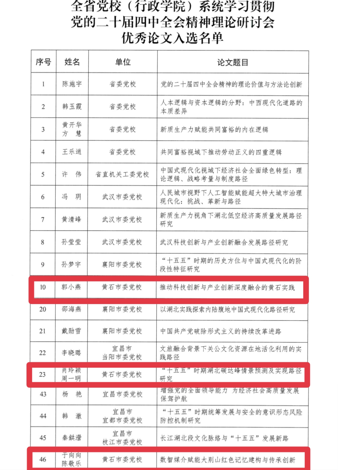 1月17日,省委党校(省行政学院)印发《关于全省党校(行政学院)系统学习贯彻党的二十届四中全会精神理论研讨会优秀论文入选情况的通知》,我校3篇论文成功入选。