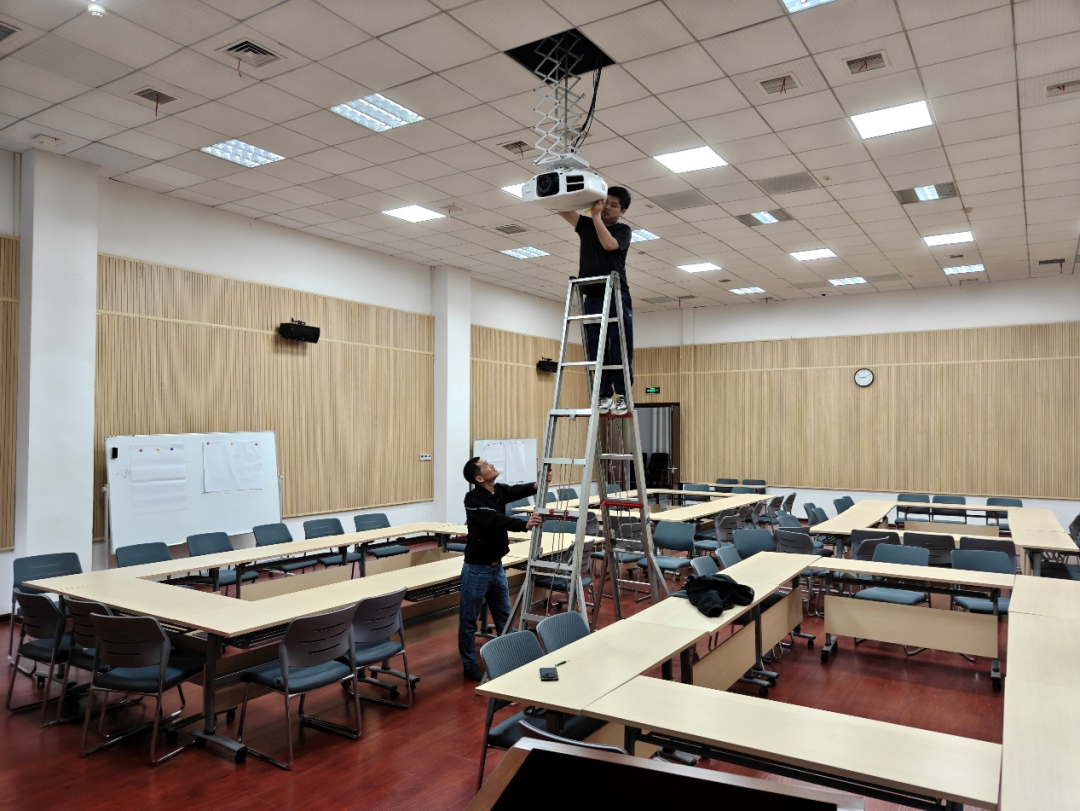本次检修聚焦教学核心设备,重点针对教室投影仪、音响系统、配套线路及终端设备开展全面检修。工作现场,技术人员严格按照运维操作规范,对投影仪进行拆卸检修、清洁调试,同步检查线路连接稳定性、音视频传输效果,逐一排查设备运行隐患,及时更换老化配件、修复接触不良等问题。针对排查中发现的设备故障,坚持“即查即修、随报随修”原则,高效完成检修工作,确保各教学设备均满足正常运行标准。