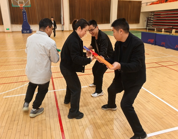 首先进行的是暖场游戏“名字接龙”,快速打破学员之间的陌生感,促进学员相互认识、相互熟悉,为后续团队协作游戏奠定基础。随后进行的“众星捧月”游戏中,各队选派8名学员共拉同心鼓,协作颠球。“稳住,大家一起往下走!”随着队长一声令下,队员们齐刷刷调整步伐,球在鼓面上稳稳弹起。“珠行万里·薪火相传”接力赛进一步诠释了“团结”精神,学员们用乒乓球拍颠球前行、依次传递。“你球拍再放平一点点,我慢慢传给你。”一位学员边颠球边鼓励队友。这不仅是一场技巧与默契的较量,更蕴含着革命精神在新时代年轻干部手中的接续传承。